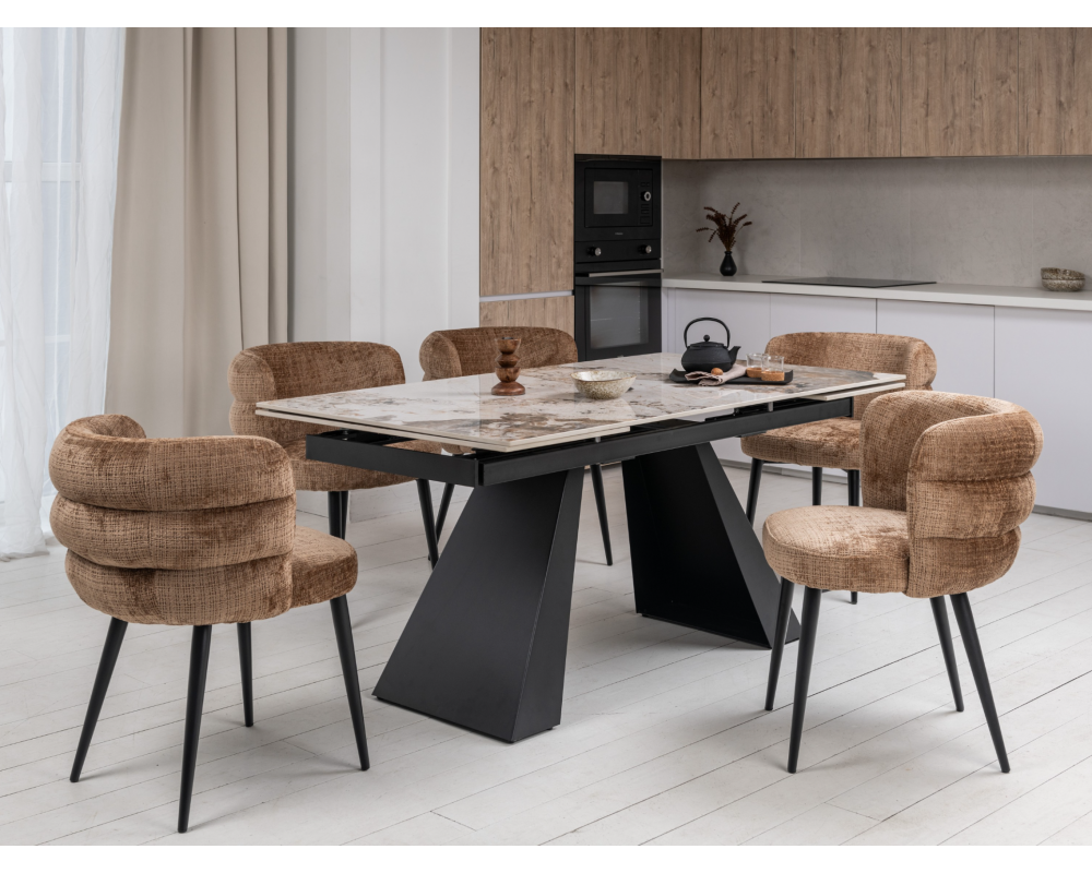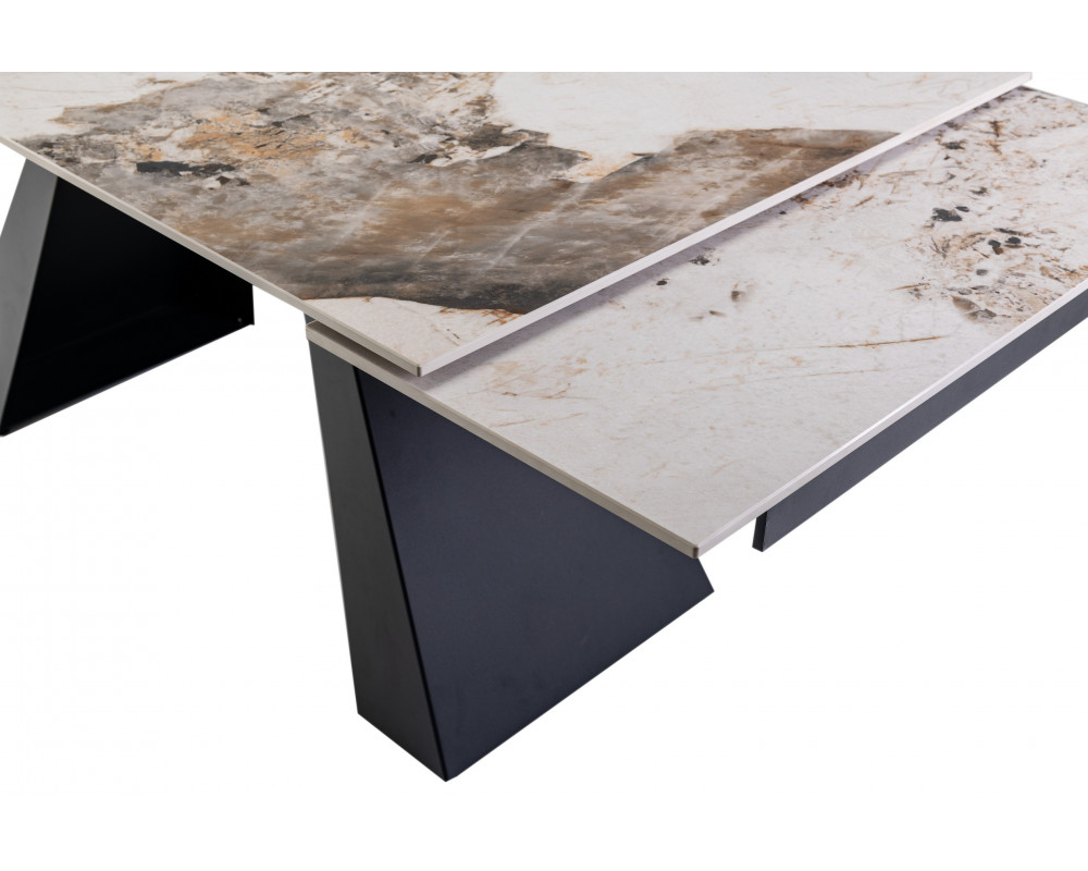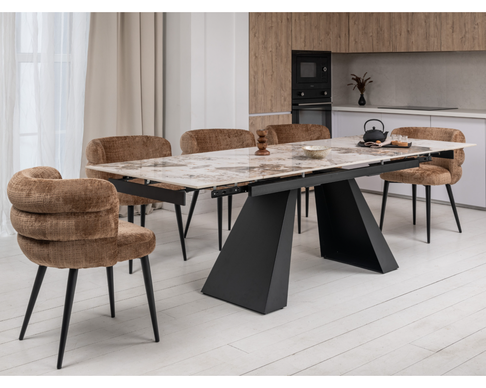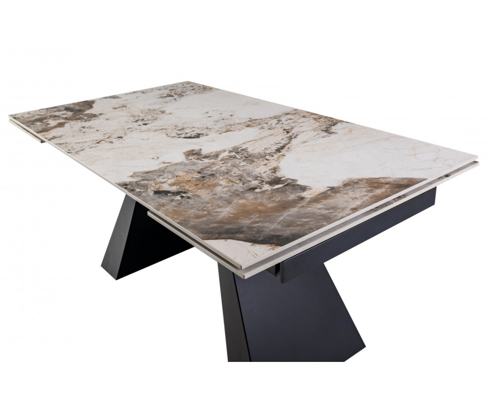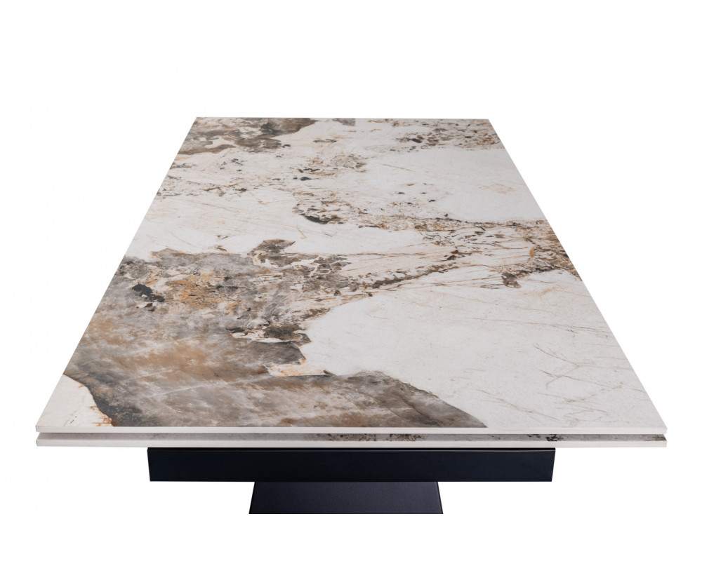 Керамический стол Чезаре TML-1100 — это истинное воплощение роскоши и практичности в современном интерьере. Главной особенностью модели является столешница из глянцевой керамики в изысканном оттенке "патагония". Этот цвет завораживает благородным сочетанием бежевых, серых и белых тонов с выразительными темными прожилками, имитирующими натуральный минерал. Благодаря надежному боковому механизму раскладки, стол легко трансформируется, позволяя с комфортом разместить большую компанию друзей или семьи. Черное металлическое основание придает конструкции устойчивость и завершает стильный современный образ.