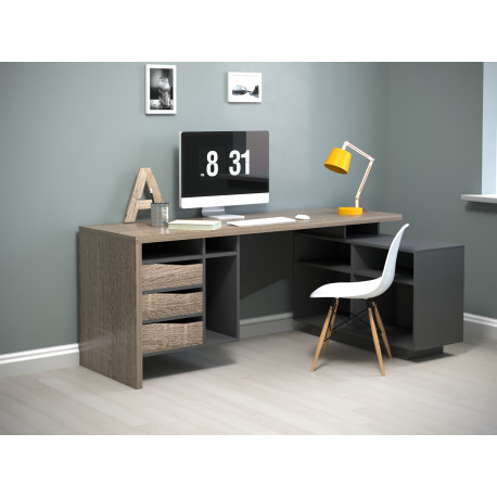 Стол письменный с тумбой Connect 2 дуб трюфель/антрацит Intarsio это вместительная модель с выдвижными ящиками, открытыми нишами и встроенной тумбой. Отличается сильным дизайном и качественными материалами. Изготовлен из ламинированного ДСП, с использованием надежной фурнитуры. Подойдёт как для домашнего кабинета, так и для современного офиса.