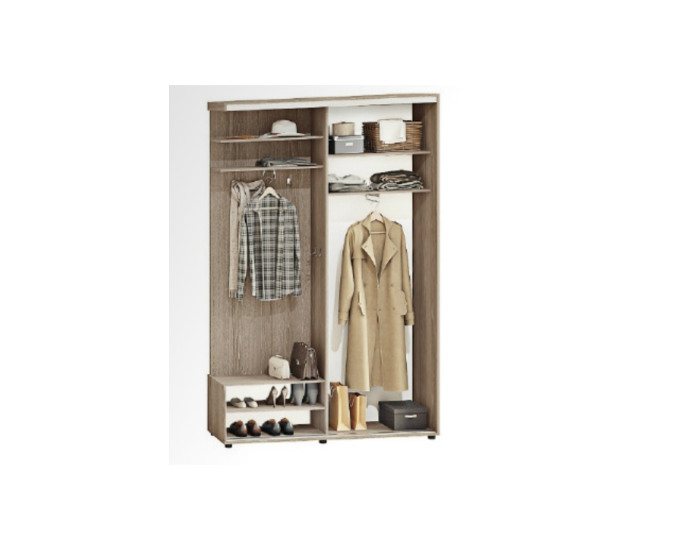 Прихожая-купе Вариант 3 ДСП Комфорт-мебель - оптимальное решение для небольшого помещения. Прихожая компактная, но конструкция предусматривает все необходимое: закрытое отделение для хранения сезонной одежды с полками и выдвижной штангой, открытое отделение с полками для головных уборов, аксессуаров, тумбу для обуви, а также крючки для одежды и сумок.
