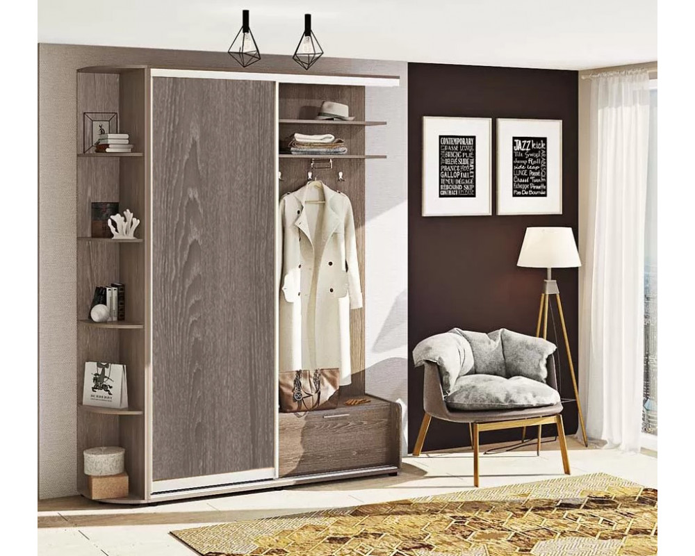 Прихожая-купе+консоль Трюфель ДСП Комфорт-мебель - оптимальное решение для небольшого помещения. Прихожая компактная, но конструкция предусматривает все необходимое: закрытое отделение для хранения сезонной одежды с полками и выдвижной штангой, открытое отделение с полками для головных уборов, аксессуаров, тумбу для обуви, а также крючки для одежды и сумок. Угловая консоль даёт возможность дополнительно разместить необходимые вещи, которые должны быть под рукой перед выходом, а также это возможность немного украсить уголок в прихожей.