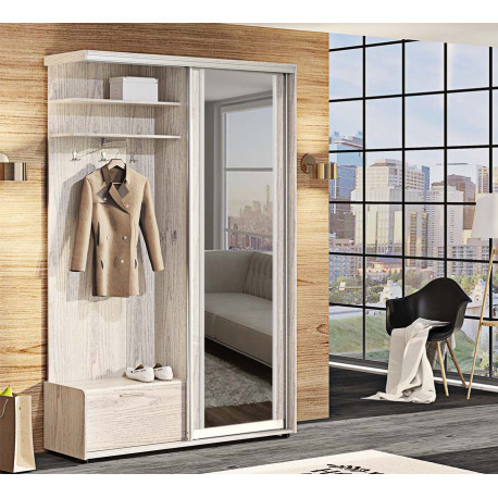 Прихожая-купе Хит Модель-7 Комфорт-мебель - оптимальное решение для небольшого помещения. Прихожая компактная, но конструкция предусматривает все необходимое: закрытое отделение для хранения сезонной одежды с полками и выдвижной штангой, открытое отделение с полками для головных уборов, аксессуаров, тумбу для обуви, а также крючки для одежды и сумок.