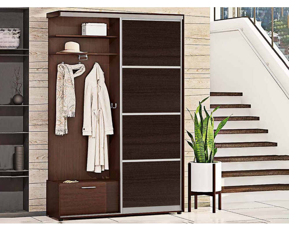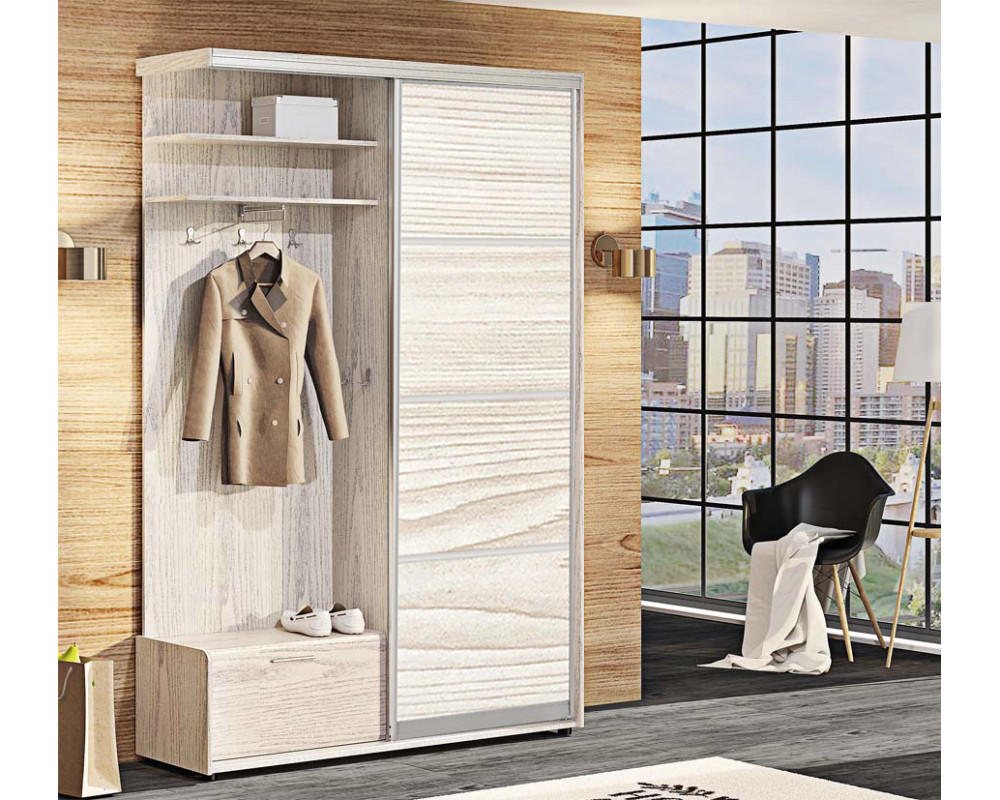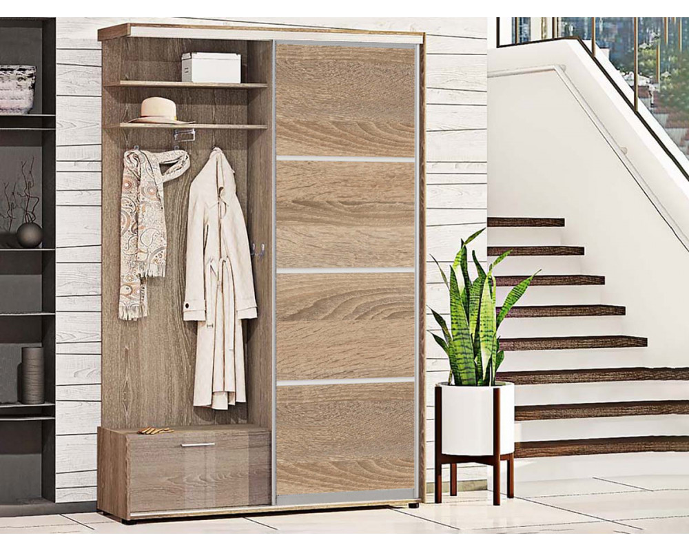 Прихожая-купе Натур ДСП из 4-х частей Комфорт-мебель - оптимальное решение для небольшого помещения. Прихожая компактная, но конструкция предусматривает все необходимое: закрытое отделение для хранения сезонной одежды с полками и выдвижной штангой, открытое отделение с полками для головных уборов, аксессуаров, тумбу для обуви, а также крючки для одежды и сумок.