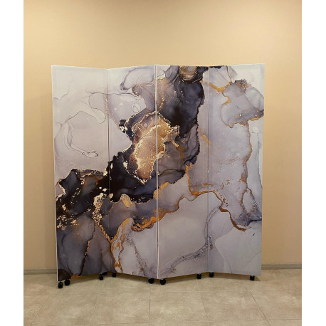 Ширма на колесиках Кантри 180х180 Абстракция черная прекрасно подойдет для декора и зонирования помещения. Каркас ширмы изготовлен из натурального дерева и состоит из четырех секций, которые обтянуты полотном с фотопечатью. При необходимости ширма компактно складывается и занимает мало места. Данная модель идеально подойдет для салона красоты или фотостудии.