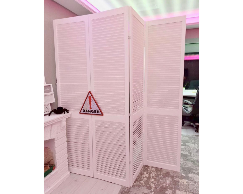 Ширма Деревянная 4 секции Кантри 200х200 см Розовая изготовлена из натурального дерева и состоит из 4-х жалюзийных дверей. При необходимости просто складывается и занимает мало места. Данная модель подойдет для оформления интерьера квартиры, кафе или салона красоты. А так же будет незаменимым элементом декора для фотостудии.