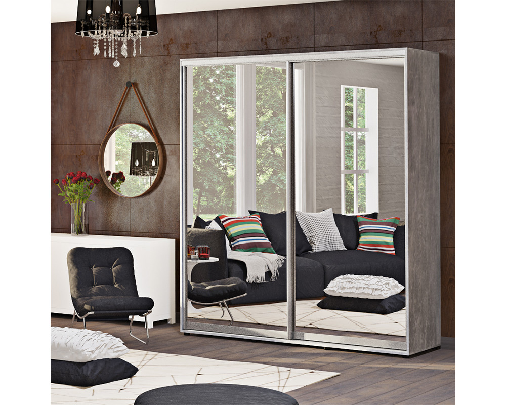 Шкаф-купе 240х45х140 Стандарт, 2 фасада Зеркало Комфорт-меблі изготовлен из ламинированного ДСП - корпус. Зеркальные фасады выполняют функцию зеркала, а также расширяют пространство и добавляют уюта. Наполнение шкафа функциональное, есть одно отделение для одежды на вешалках и отделение с полками.