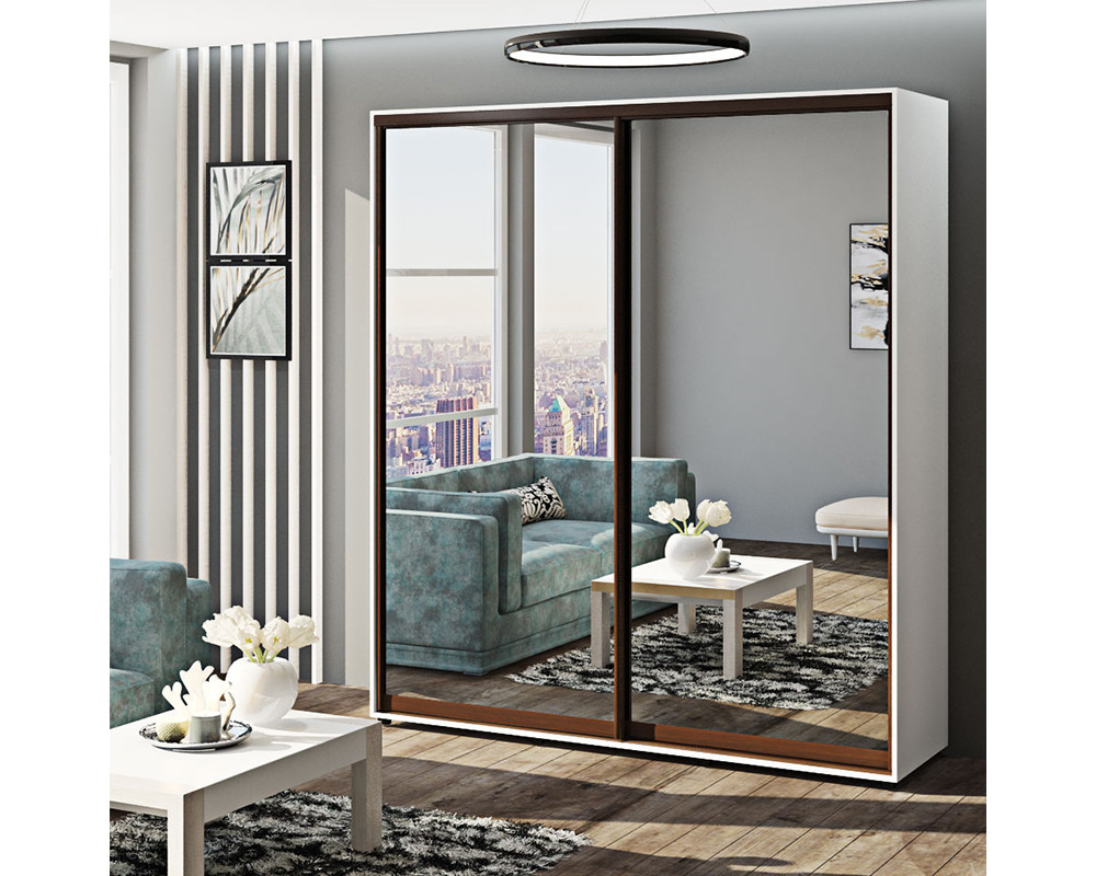 Шкаф-купе 240х60х110 Стандарт, 2 фасада Зеркало Комфорт-меблі изготовлен из ламинированного ДСП - корпус. Зеркальные фасады выполняют функцию зеркала, а также расширяют пространство и добавляют уюта. Наполнение шкафа функциональное, есть одно отделение для одежды на вешалках и отделение с полками.