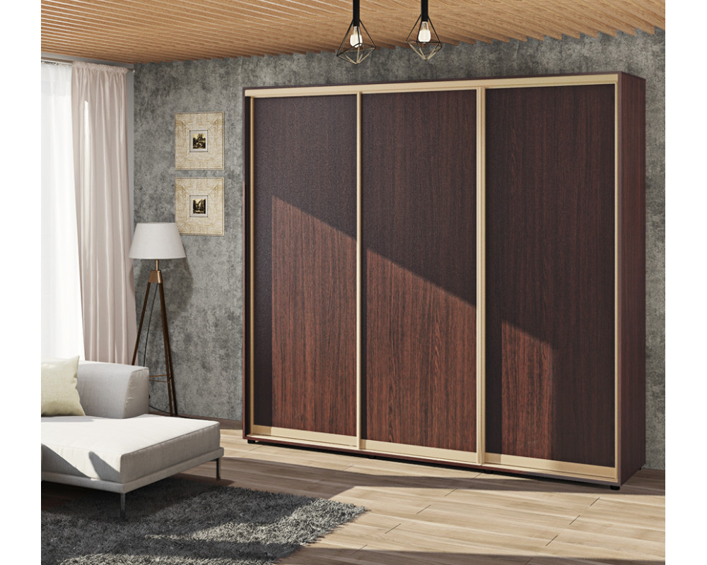 Шкаф-купе 240х45х180 Стандарт, 3 фасада ДСП Комфорт-меблі изготовлен из ламинированного ДСП (корпус и фасад). Наполнение шкафа функциональное, есть два отделения для одежды на вешалках и отделение с полками.