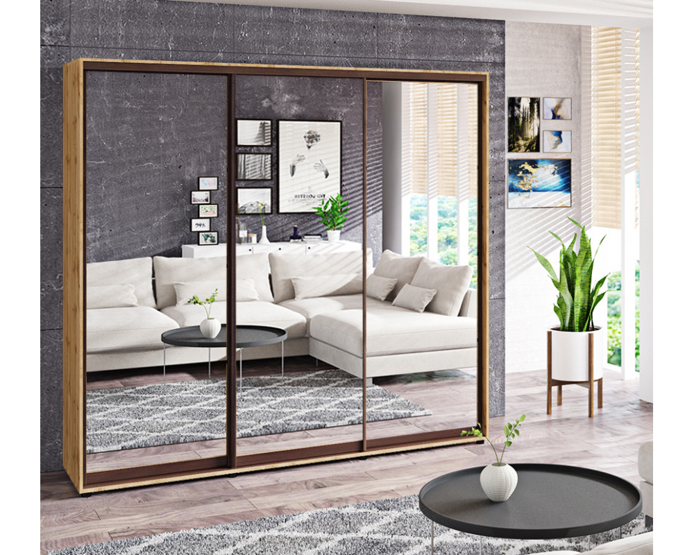 Шкаф-купе 240х45х180 Стандарт, 3 фасада Зеркало Комфорт-меблі изготовлен из ламинированного ДСП - корпус, а фасад - зеркала которые визуально расширяют пространство. Наполнение шкафа функциональное, есть два отделения для одежды на вешалках и отделение с полками.