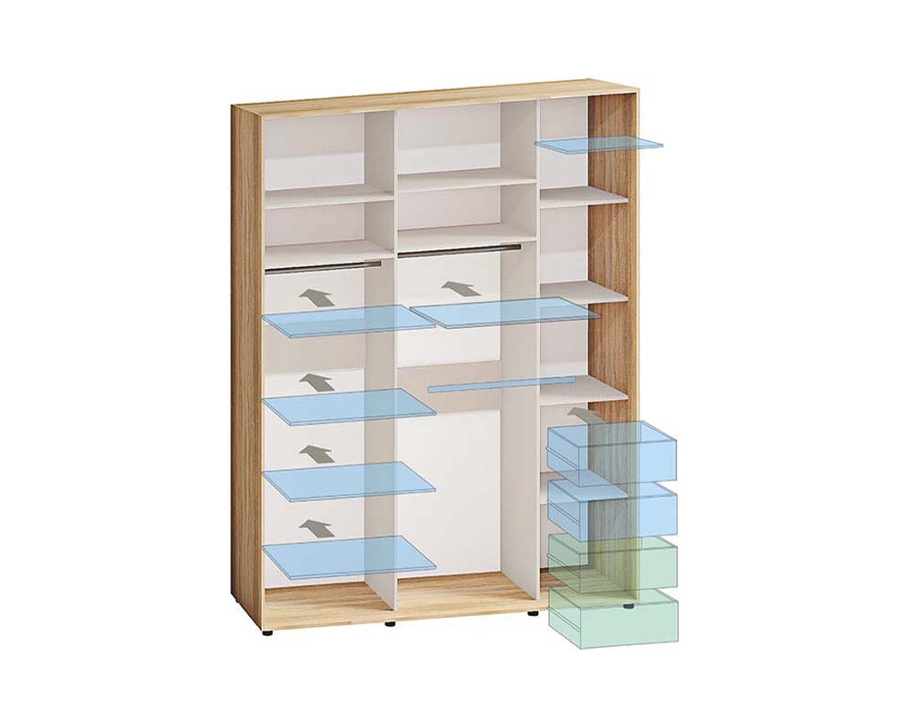 Шкаф-купе 240х60х180 Стандарт, 3 фасада ДСП Комфорт-меблі изготовлен из ламинированного ДСП (корпус и фасад). Наполнение шкафа функциональное, есть два отделения для одежды на вешалках и отделение с полками.