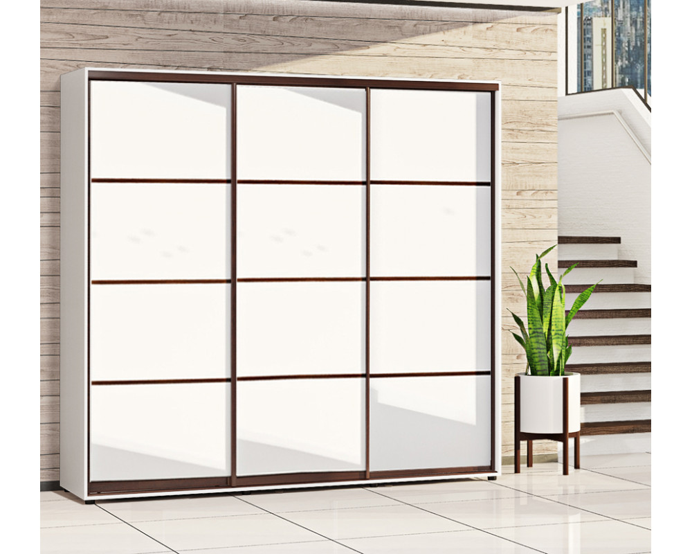 Шкаф-купе 240х60х210 Стандарт, 3 фасада ДСП из 4 частей Комфорт-меблі изготовлен из ламинированного ДСП (корпус и фасад). Наполнение шкафа функциональное, есть два отделения для одежды на вешалках и отделение с полками.