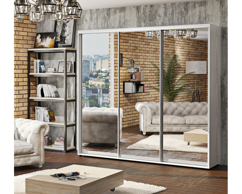 Шкаф-купе 240х60х240 Стандарт, 3 фасада Зеркало Комфорт-меблі изготовлен из ламинированного ДСП - корпус, а фасад - зеркала которые визуально расширяют пространство. Наполнение шкафа функциональное, есть два отделения для одежды на вешалках и отделение с полками.