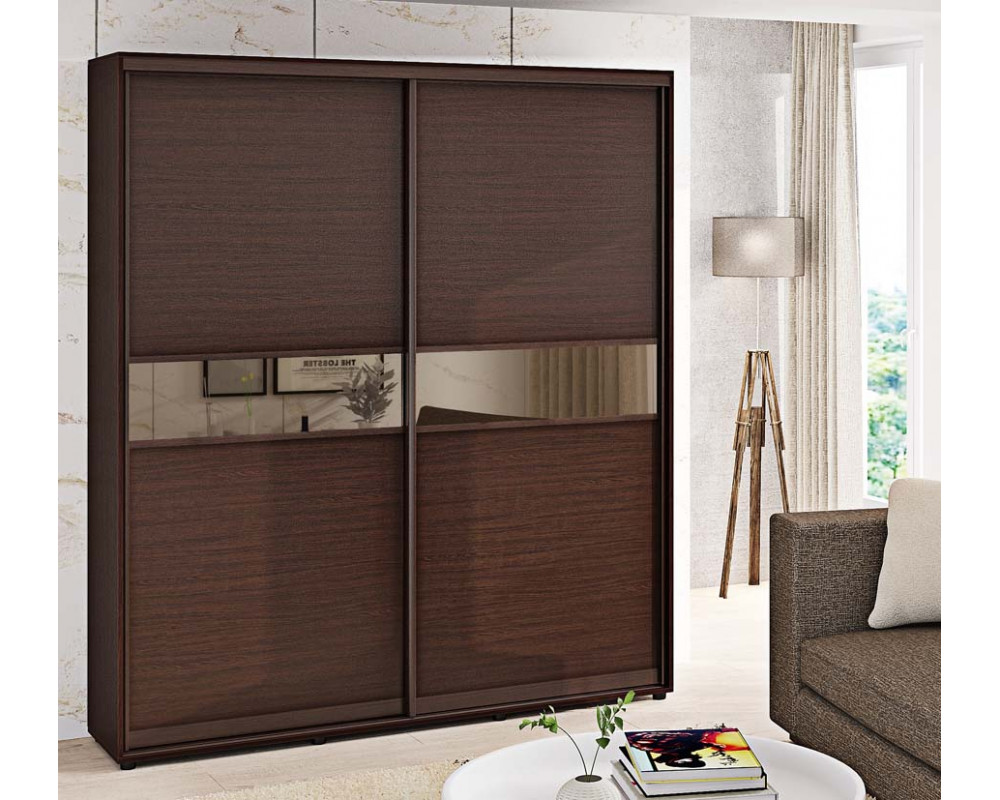 Шкаф-купе 240х60х1430 Стандарт, 2 фасада Модель-2 Комфорт-меблі изготовлен из ламинированного ДСП - корпус, а фасад стильная комбинация ДСП и зеркала или цветных вставок. Наполнение шкафа функциональное, есть отделение для одежды на вешалках и отделение с полками.