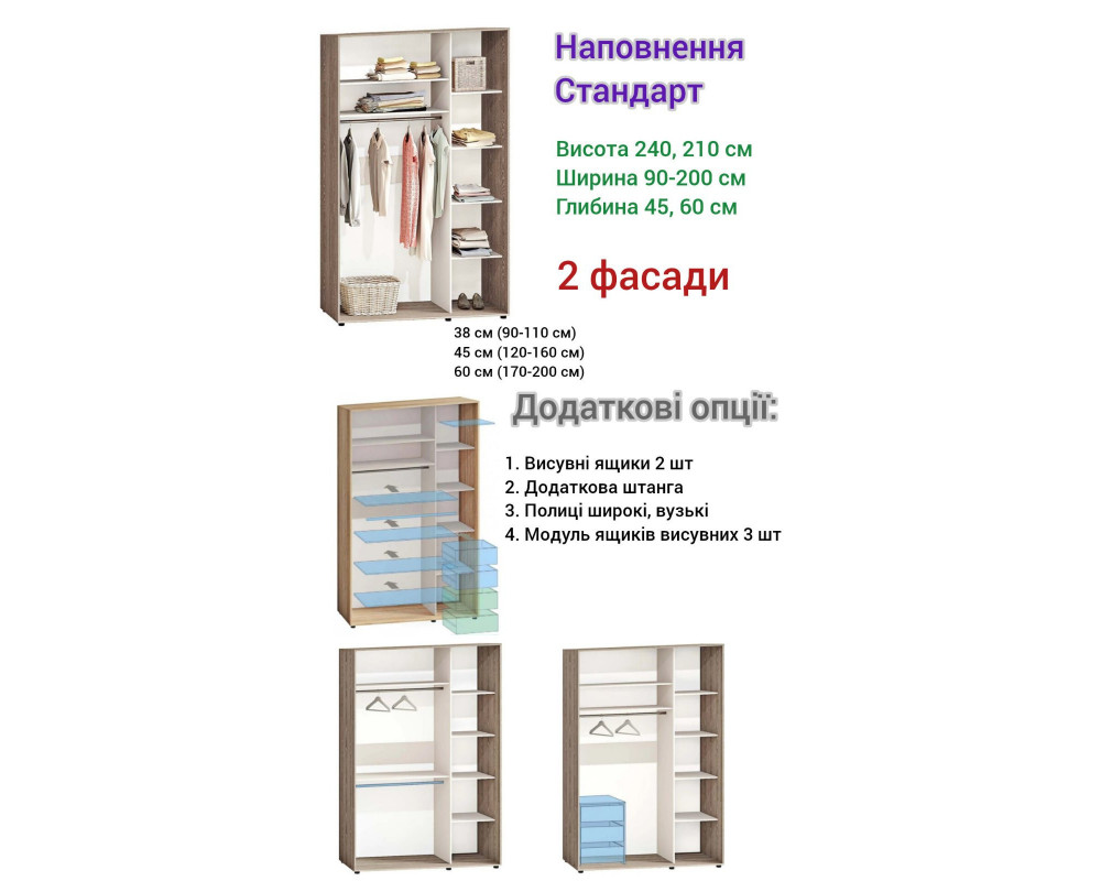 Шкаф-купе 240х60х160 Стандарт, 2 фасада Модель-2 Комфорт-меблі изготовлен из ламинированного ДСП - корпус, а фасад стильная комбинация ДСП и зеркала или цветных вставок. Наполнение шкафа функциональное, есть отделение для одежды на вешалках и отделение с полками.