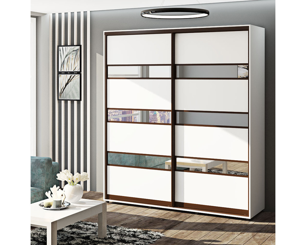 Шкаф-купе 240х45х120 Стандарт, 2 фасада Модель-4 Комфорт-меблі изготовлен из ламинированного ДСП - корпус, а фасад стильная комбинация ДСП и зеркала или цветных вставок. Наполнение шкафа функциональное, есть отделение для одежды на вешалках и отделение с полками.