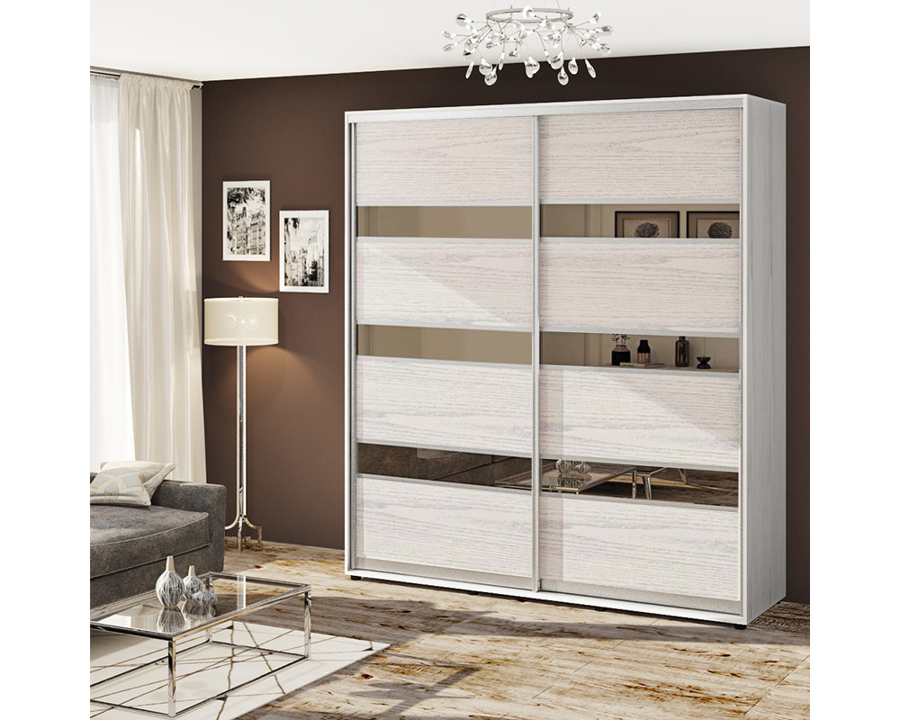 Шкаф-купе 240х60х100 Стандарт, 2 фасада Модель-4 Комфорт-меблі изготовлен из ламинированного ДСП - корпус, а фасад стильная комбинация ДСП и зеркала или цветных вставок. Наполнение шкафа функциональное, есть отделение для одежды на вешалках и отделение с полками.