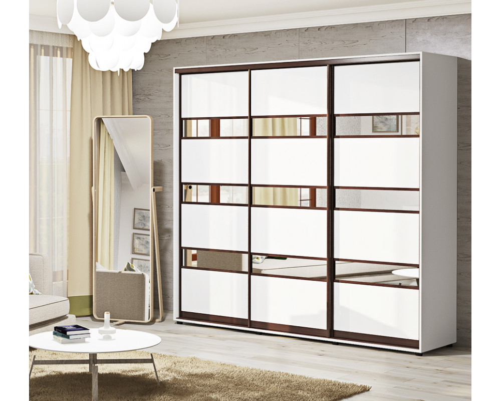 Шкаф-купе 240х60х210 Стандарт, 3 фасада Модель-4 Комфорт-меблі изготовлен из ламинированного ДСП - корпус, а фасад стильная комбинация ДСП и зеркала или цветных вставок. Наполнение шкафа функциональное, есть два отделения для одежды на вешалках и отделение с полками.