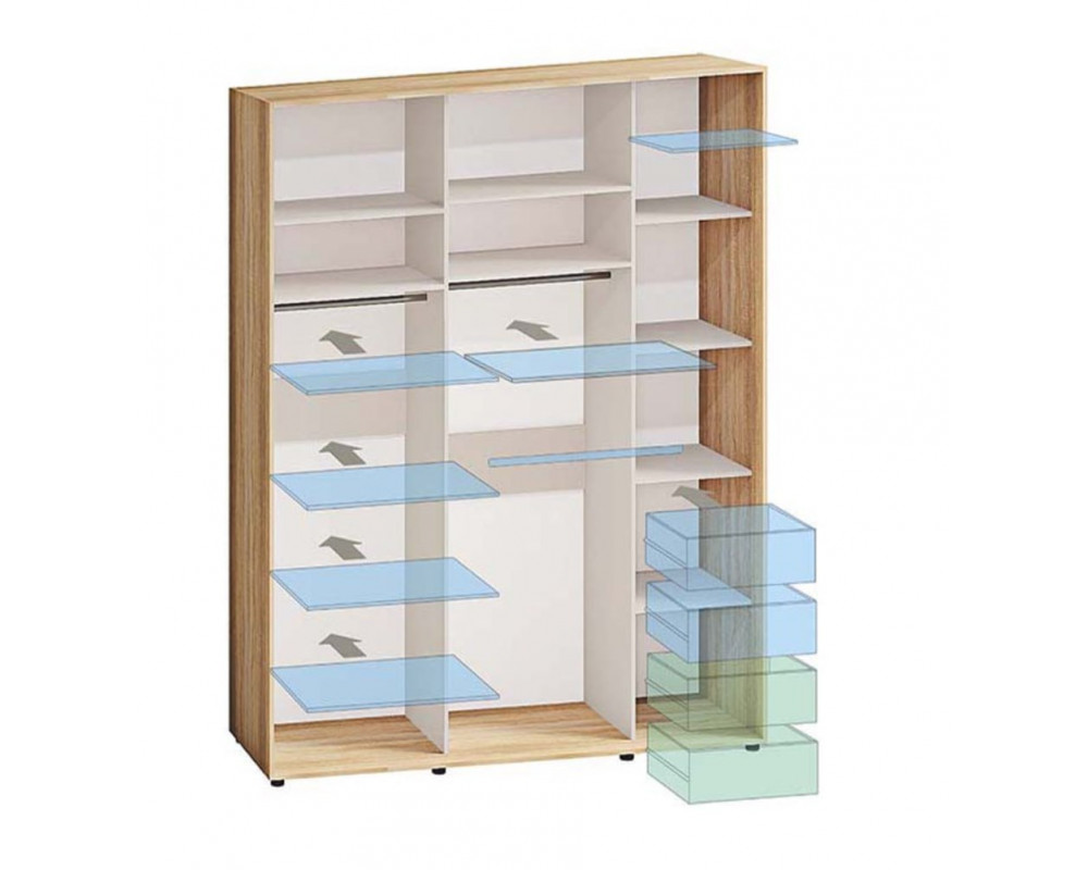 Шкаф-купе 240х60х260 Стандарт, 3 фасада Модель-4 Комфорт-меблі изготовлен из ламинированного ДСП - корпус, а фасад стильная комбинация ДСП и зеркала или цветных вставок. Наполнение шкафа функциональное, есть два отделения для одежды на вешалках и отделение с полками.
