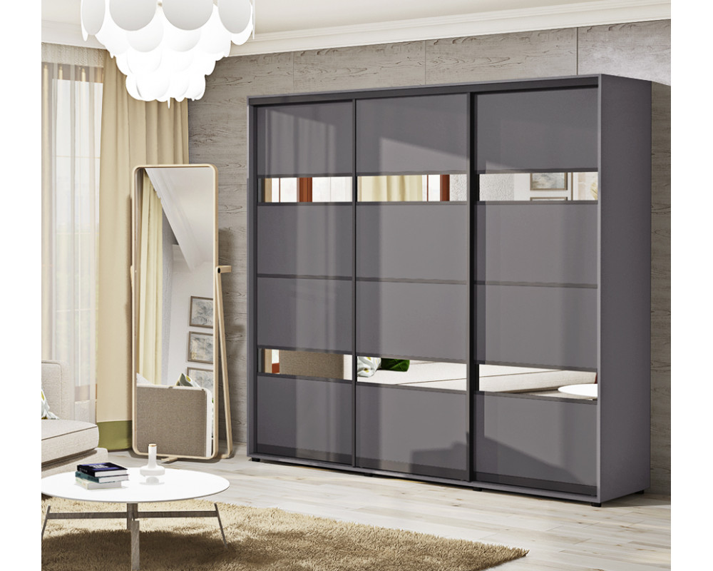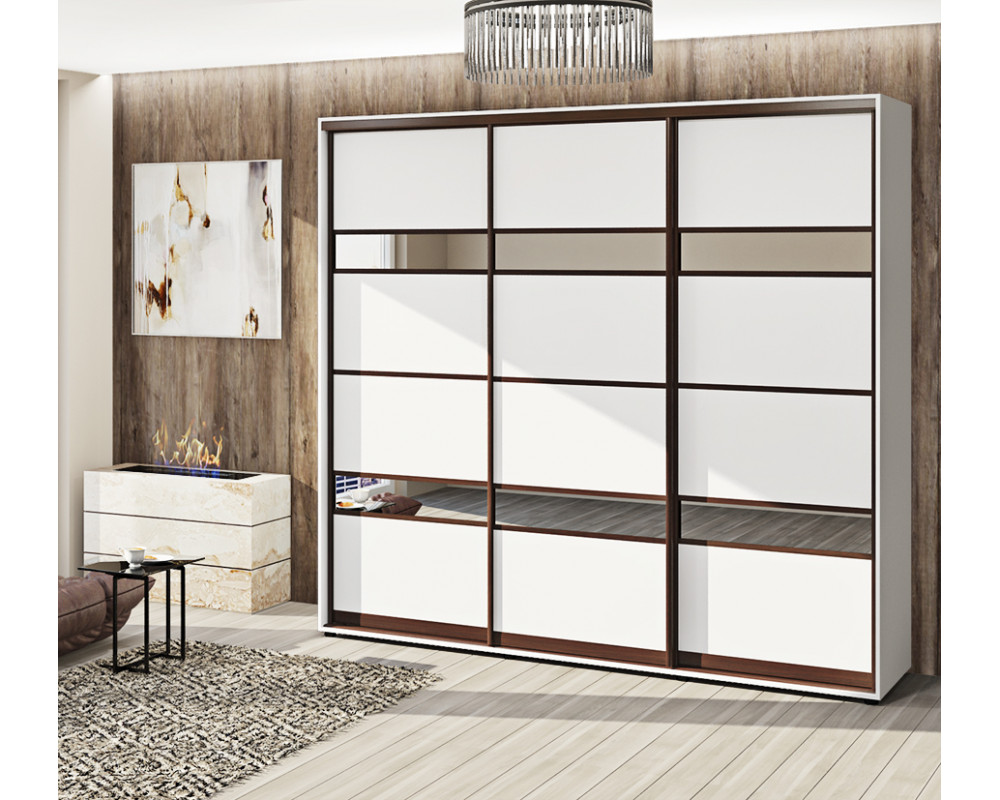 Шкаф-купе 240х60х250 Стандарт, 3 фасада Модель-5 Комфорт-меблі изготовлен из ламинированного ДСП - корпус, а фасад стильная комбинация ДСП и зеркала или цветных вставок. Наполнение шкафа функциональное, есть два отделения для одежды на вешалках и отделение с полками.