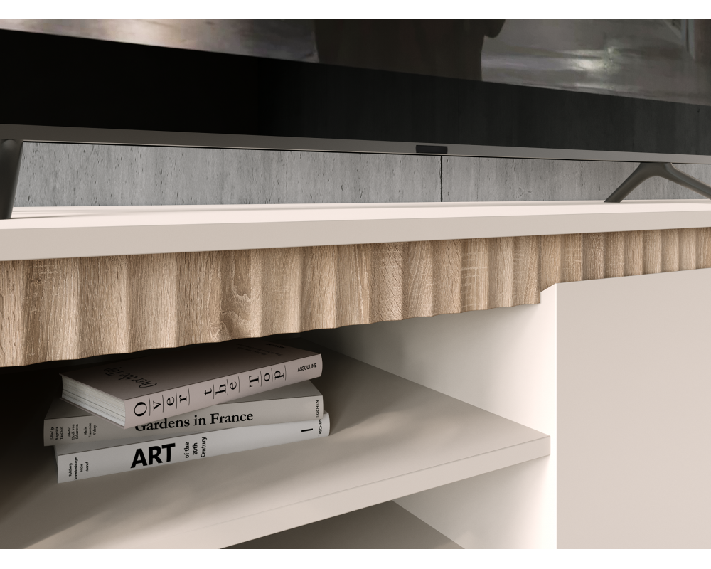 Стенка для гостиной Лаундж мини/Lounge BRW-Украина выполнена в современном минималистичном стиле. Цвет мебели — кашемир с акцентами под дуб сонома, что придает интерьеру тепло и уют. Комплект состоит из тумбы под телевизор с открытыми полками и ящиками, а также вместительного комода с одной выдвижной секцией. Лаконичные линии и скрытые ручки подчеркивают минимализм дизайна. Универсальная расцветка позволяет мебели легко вписаться в современный интерьер, создавая светлую и элегантную атмосферу.