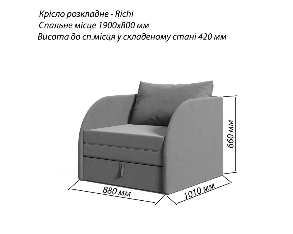 Крісло-ліжко Viorina-Deko RICHI ALLURE Grey виготовлене фабрикою з якісних та безпечних матеріалів, не займає багато місця та підійде для невеликої кімнати. Тканинна оббивка міцна та практична. Простий та надійний механізм розкладки забезпечує комфортне спальне місце.