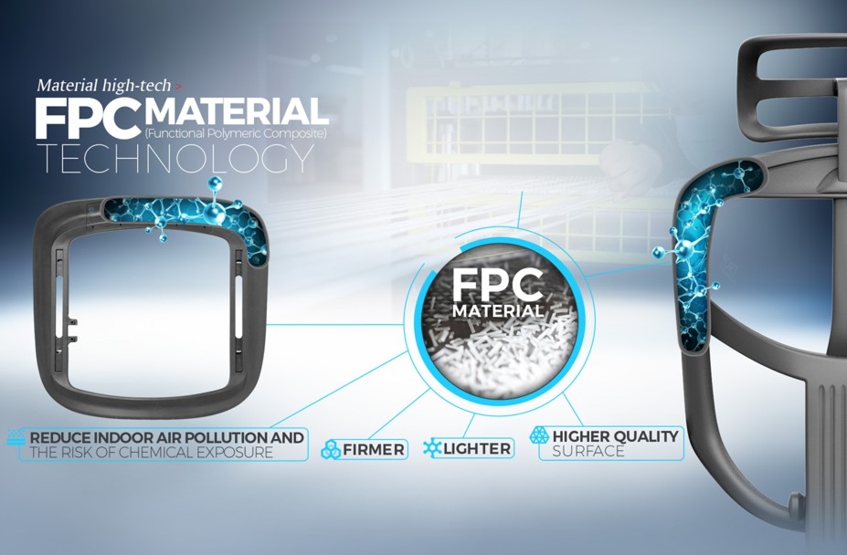 Каркаса сидіння, спинки та підголовника виготовлений з нового матеріалу FPC. Функціональний полімерний композит набагато екологічніший за звичайний пластик, як у виробництві, так і при експлуатації крісла в закритому приміщенні. Немає неприємного запаху. Забезпечує не лише довговічність каркасу, а й сітки.