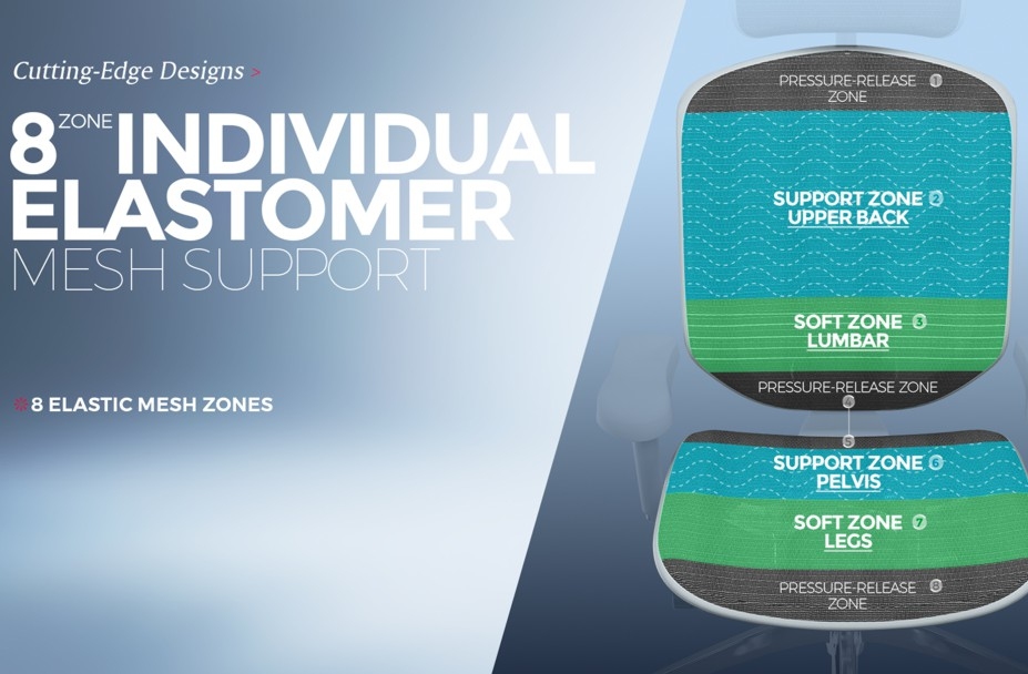 У нижній частині спинки прихований еластичний пояс, що регулюється за ступенем натягу, для кращої підтримки постничного відділу, запатентована технологія "STEALTH 5X". Вся спинка регулюється по висоті в діапазоні 70 мм і фіксується в 6-ти позиціях і налаштовується в заздрості від ваги та статури користувача.