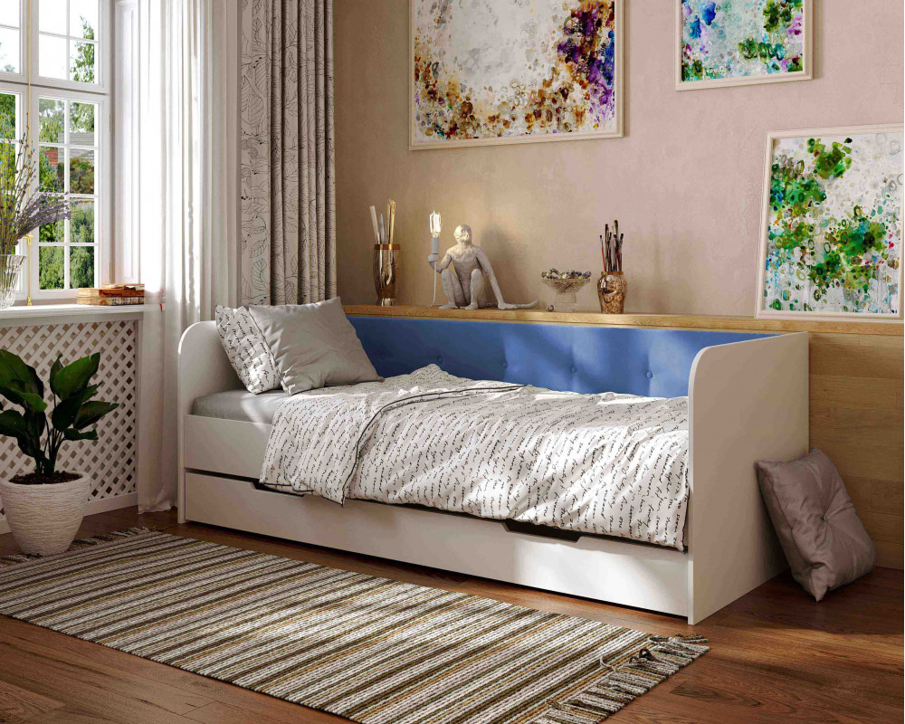 Ліжко односпальне Valencia з шухлядою+захисний бортик Viorina-Deko синій виготовлено фабрикою з якісних і безпечних матеріалів. Каркас з ЛДСП 16 мм(Swisspan). Сучасний дизайн ліжка та стильне поєднання ЛДСП у такому оригінальному забарвленні підкреслить затишну атмосферу спальні.