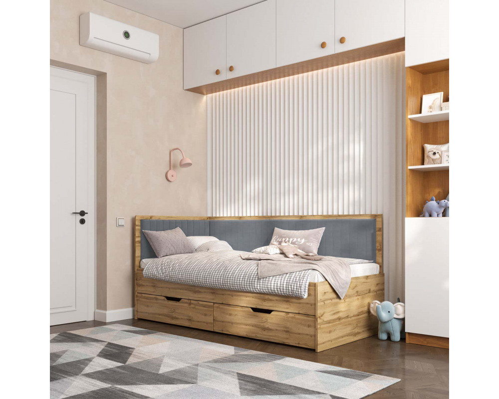 Ліжко з ящиками Brooklyn Grey/Тахо виготовлене фабрикою Viorina-Deko з якісних та безпечних матеріалів. Спинка ліжка в тканинній оббивці, приємна на дотик і створює додатковий затишок для сну. Сучасний дизайн та яскраве забарвлення ліжка змінять інтер'єр будь-якої кімнати.