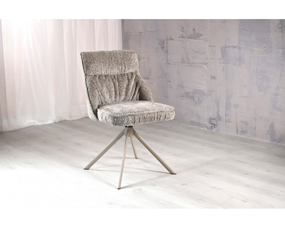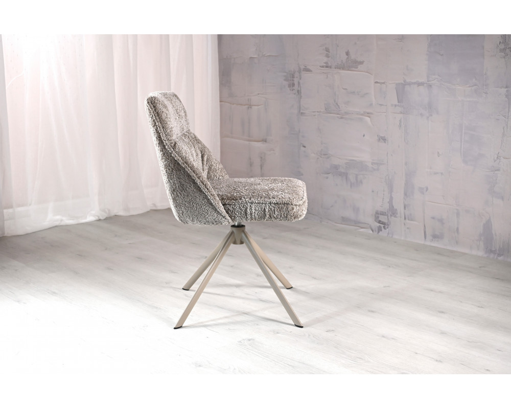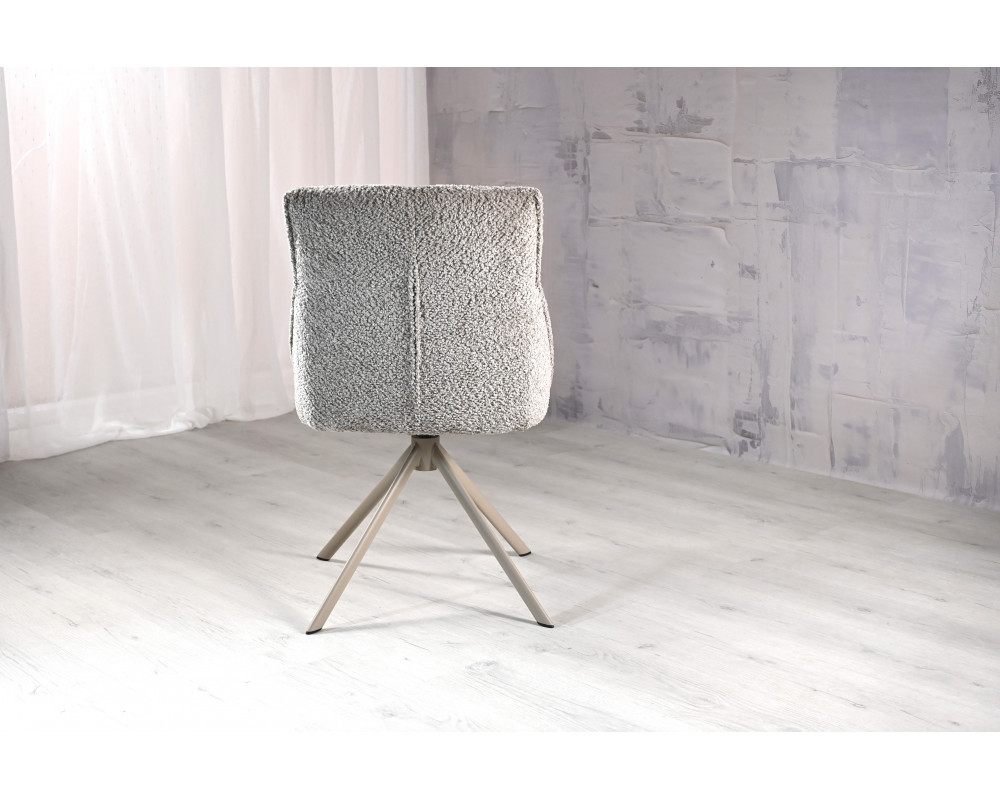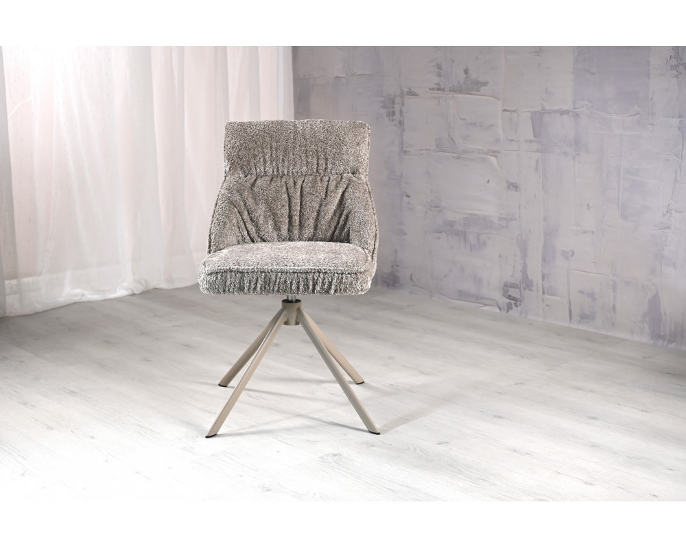 Поворотний стілець R-168 у благородному поєднанні перлинного таупу та капучино — це втілення ергономіки та стилю. Модель оснащена функцією обертання на 360° з автоповоротом, що забезпечує максимальну свободу рухів. Використання трендової тканини букле надає стільцю особливої м'якості, затишку та вишуканого візуального об'єму.
