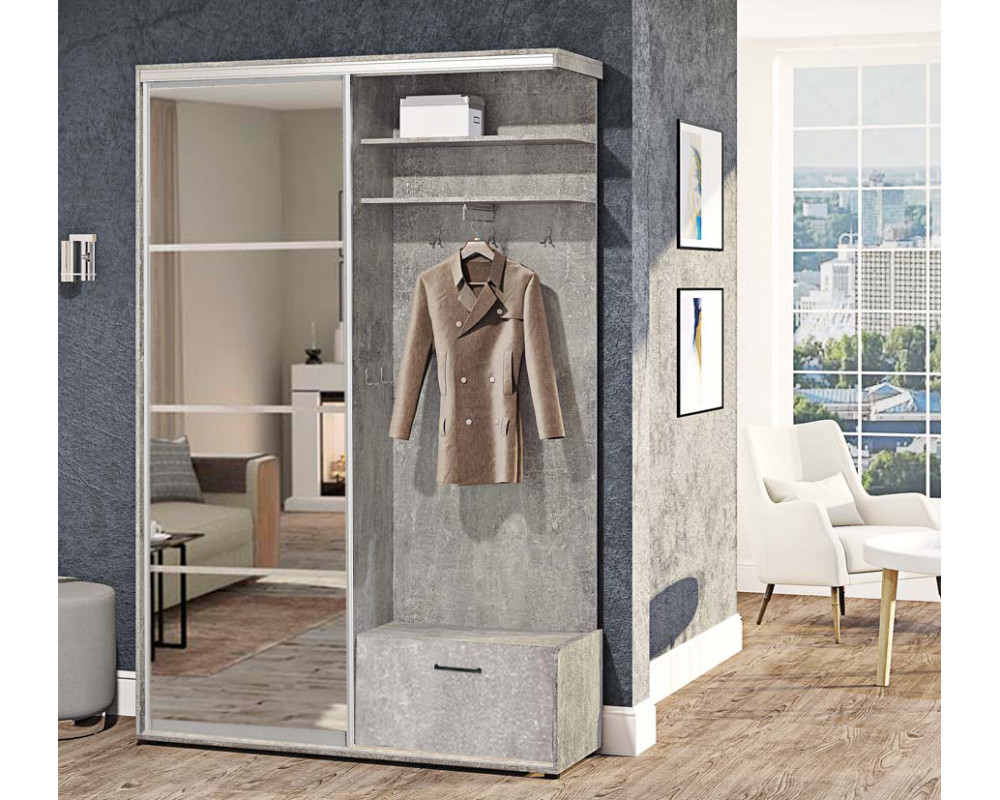 Передпокій-купе Бетон Дзеркало з 4-х частин Комфорт-меблі - оптимальне рішення для невеликого приміщення. Передпокій компактний, але конструкція передбачає все необхідне: закрите відділення для зберігання сезонного одягу з полками і висувною штангою, відкрите відділення з полками для головних уборів, аксесуарів, тумбу для взуття, а також гачки для одягу та сумок.