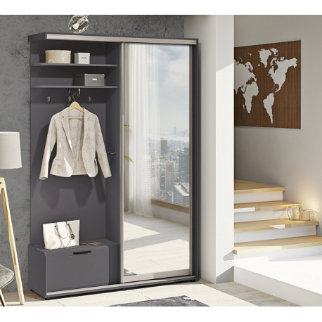 Передпокій-купе Графіт Дзеркало Комфорт-меблі - оптимальне рішення для невеликого приміщення. Передпокій компактний, але конструкція передбачає все необхідне: закрите відділення для зберігання сезонного одягу з полками і висувною штангою, відкрите відділення з полками для головних уборів, аксесуарів, тумбу для взуття, а також гачки для одягу та сумок.