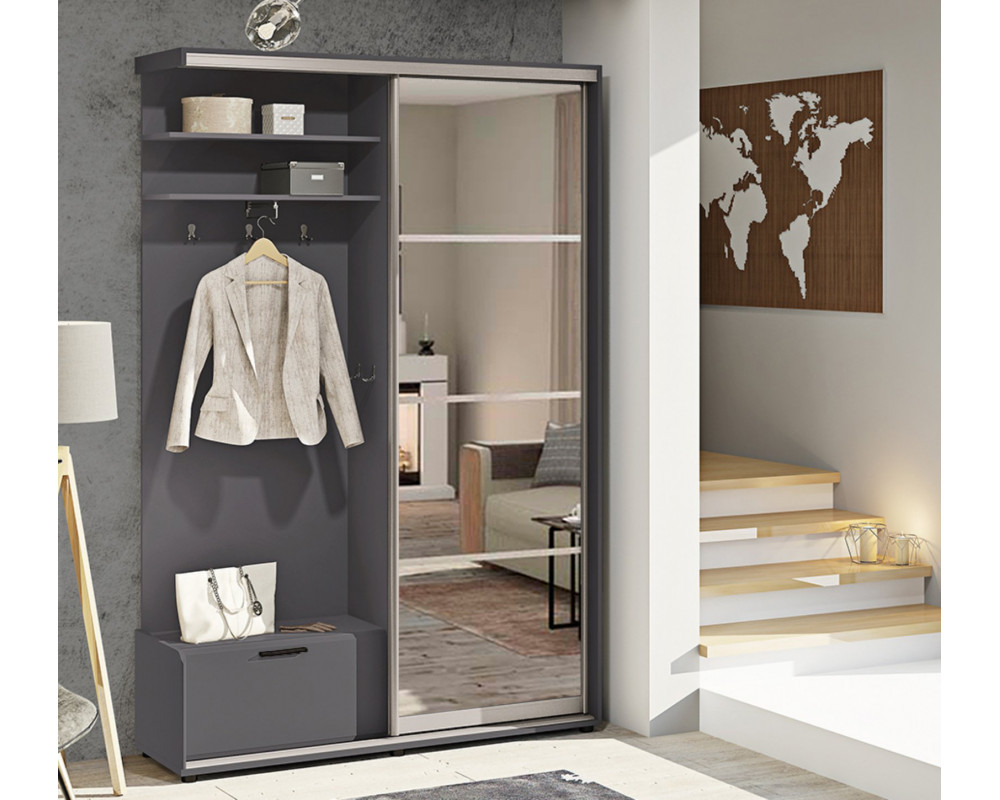 Передпокій-купе Голд Дзеркало з 4-х частин Комфорт-меблі - оптимальне рішення для невеликого приміщення. Передпокій компактний, але конструкція передбачає все необхідне: закрите відділення для зберігання сезонного одягу з полками і висувною штангою, відкрите відділення з полками для головних уборів, аксесуарів, тумбу для взуття, а також гачки для одягу та сумок.