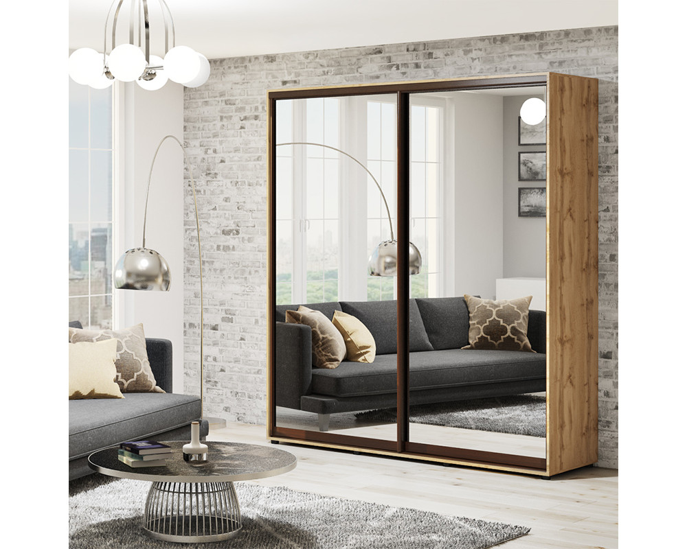 Шафа-купе 240х45х130 Стандарт, 2 фасади Дзеркало Комфорт-меблі виготовлена з ламінованого ДСП - корпус. Дзеркальні фасади виконують функцію дзеркала, а також розширюють простір і додають затишку. Наповнення шафи функціональне, є один відділ для одягу на вішаках і відділ з полками.