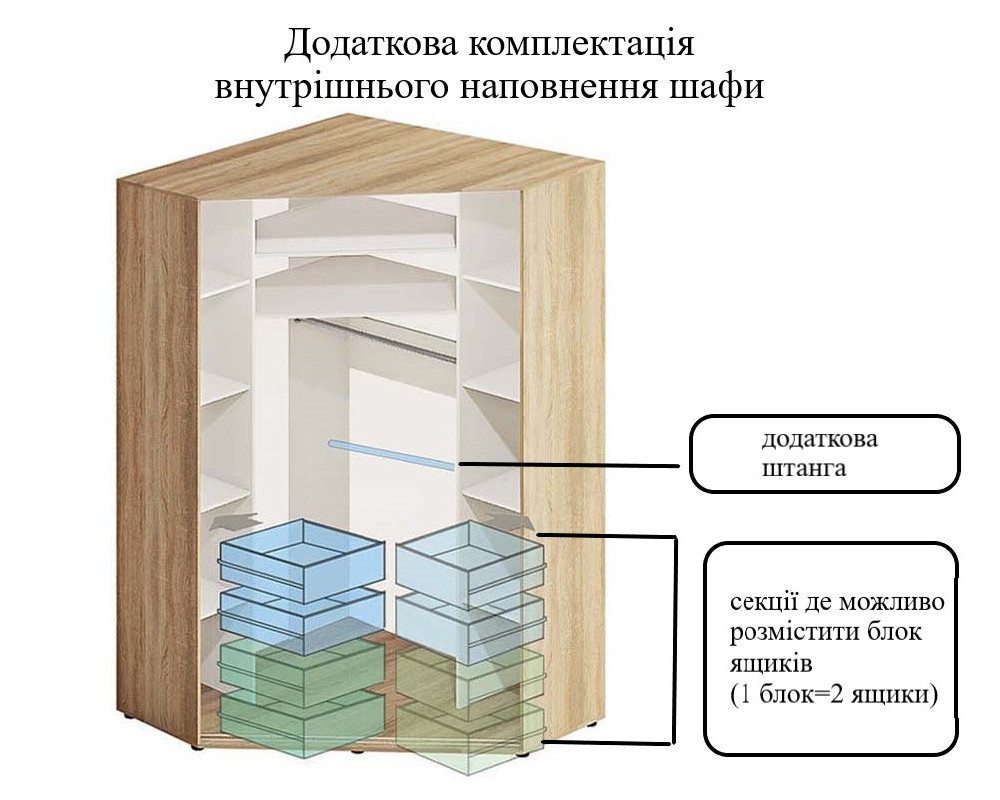 Шафа-купе кутова 130х130х60х240 Моно-кут, фасади Дзеркало+ДСП Комфорт-Меблі - оптимальне рішення для тих, хто хоче розмістити багато речей. Шафа передбачає все необхідне: бокові полички з двох боків, полички вгорі і штанга для вішаків.