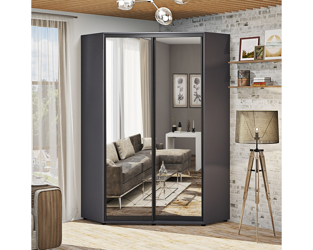 Шафа-купе кутова 130х130х60х240 Моно-кут, фасади Дзеркало Комфорт-Меблі - оптимальне рішення для тих, хто хоче розмістити багато речей. Шафа передбачає все необхідне: бокові полички з двох боків, полички вгорі і штанга для вішаків.