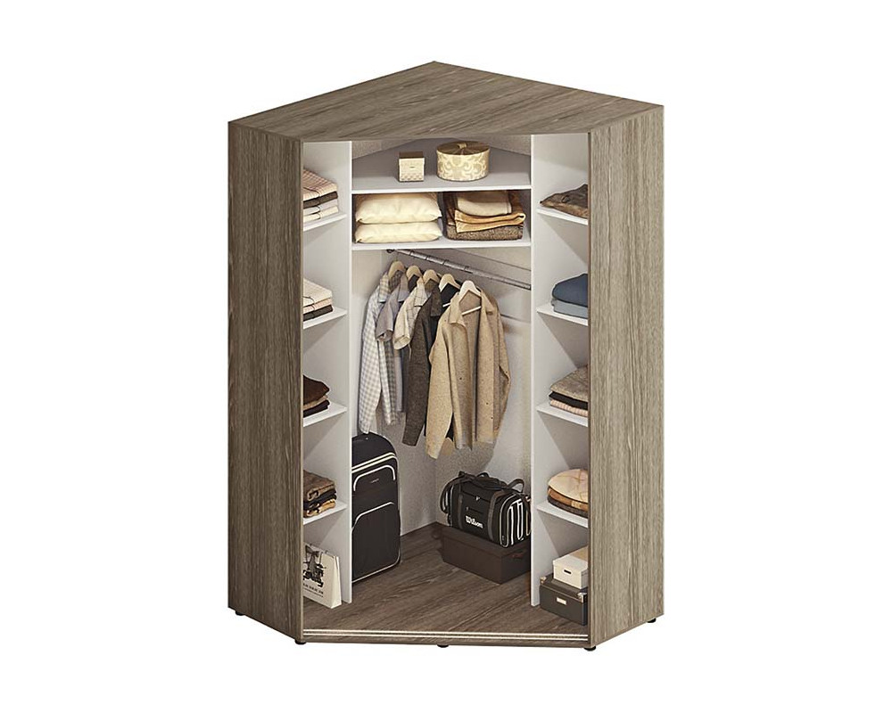 Шафа-купе кутова 130х130х60х240 Моно-кут, фасади ДСП з 4 частин Комфорт-Меблі - оптимальне рішення для тих, хто хоче розмістити багато речей. Шафа передбачає все необхідне: бокові полички з двох боків, полички вгорі і штанга для вішаків.