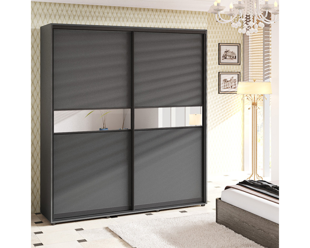 Шафа-купе 240х60х200 Стандарт, 2 фасади Модель-2 Комфорт-меблі виготовлена з ламінованого ДСП - корпус, а фасад - стильна комбінація ДСП і дзеркала або кольорових вставок. Наповнення шафи функціональне, є відділ для одягу на вішаках і відділ з полками.