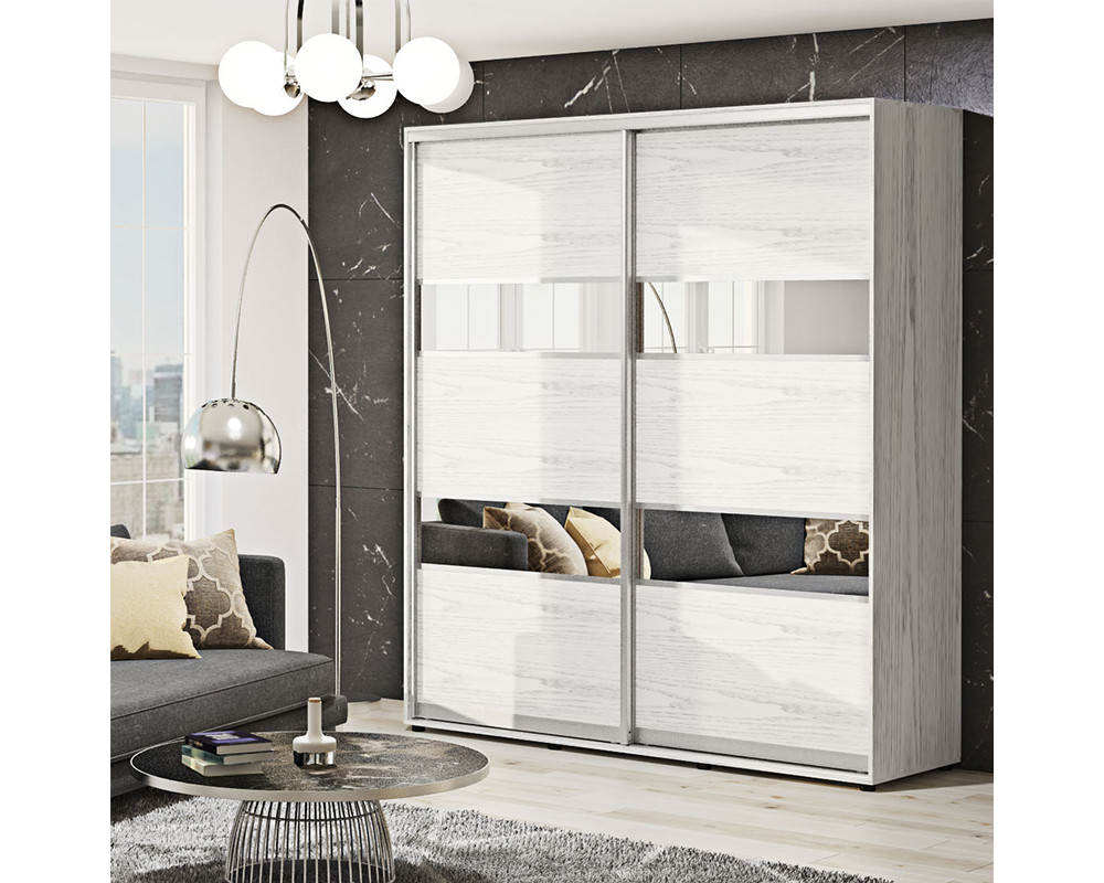 Шафа-купе 240х60х100 Стандарт, 2 фасади Модель-3 Комфорт-меблі виготовлена з ламінованого ДСП - корпус, а фасад - стильна комбінація ДСП і дзеркала або кольорових вставок. Наповнення шафи функціональне, є відділ для одягу на вішаках і відділ з полками.