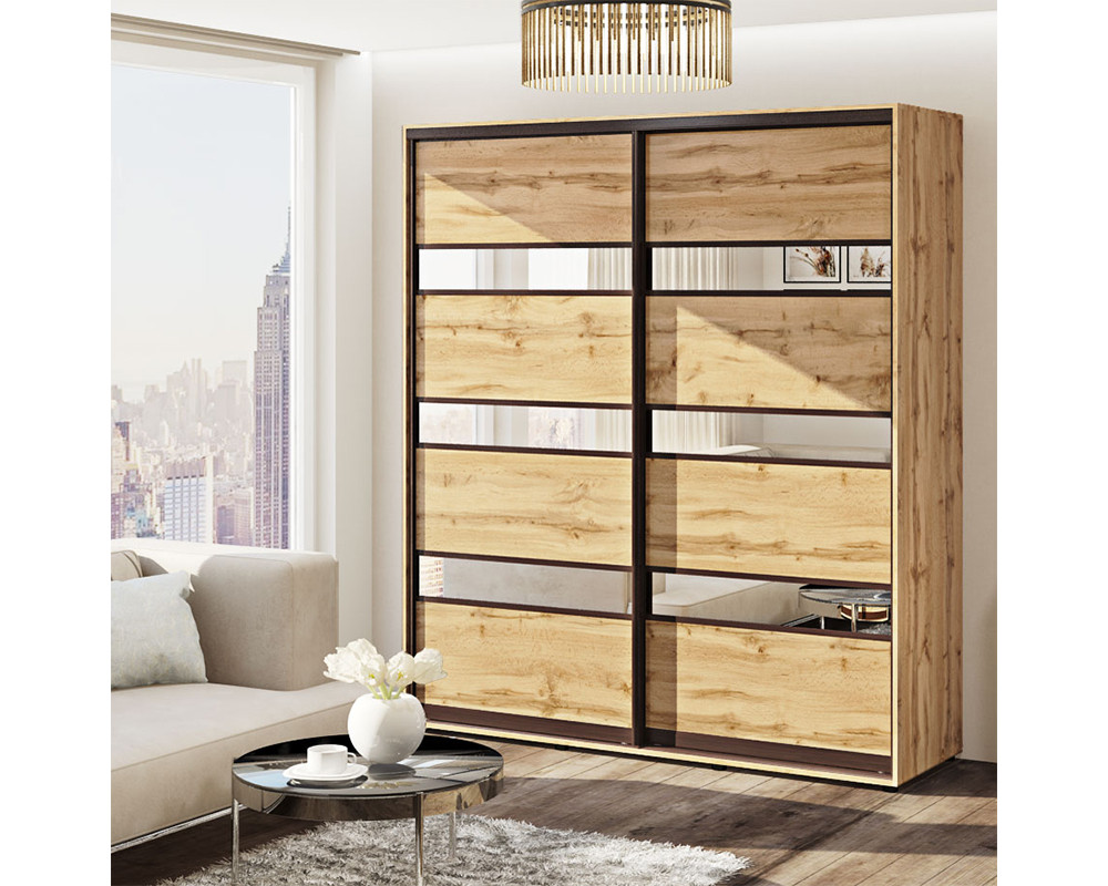 Шафа-купе 240х60х130 Стандарт, 2 фасади Модель-4 Комфорт-меблі виготовлена з ламінованого ДСП - корпус, а фасад - стильна комбінація ДСП і дзеркала або кольорових вставок. Наповнення шафи функціональне, є відділ для одягу на вішаках і відділ з полками.
