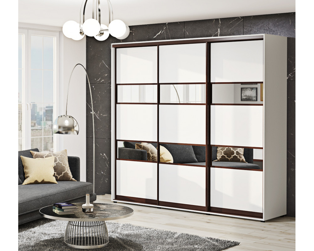 Шафа-купе 240х60х270 Стандарт, 3 фасади Модель-3 Комфорт-меблі виготовлена з ламінованого ДСП - корпус, а фасад - стильна комбінація ДСП і дзеркала або кольорових вставок. Наповнення шафи функціональне, є два відділа для одягу на вішаках і відділ з полками.