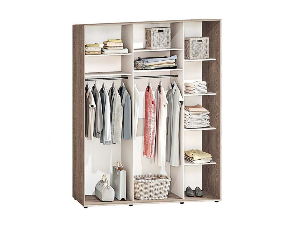 Шафа-купе 240х60х220 Стандарт, 3 фасади Модель-5 Комфорт-меблі виготовлена з ламінованого ДСП - корпус, а фасад - стильна комбінація ДСП і дзеркала або кольорових вставок. Наповнення шафи функціональне, є два відділа для одягу на вішаках і відділ з полками.