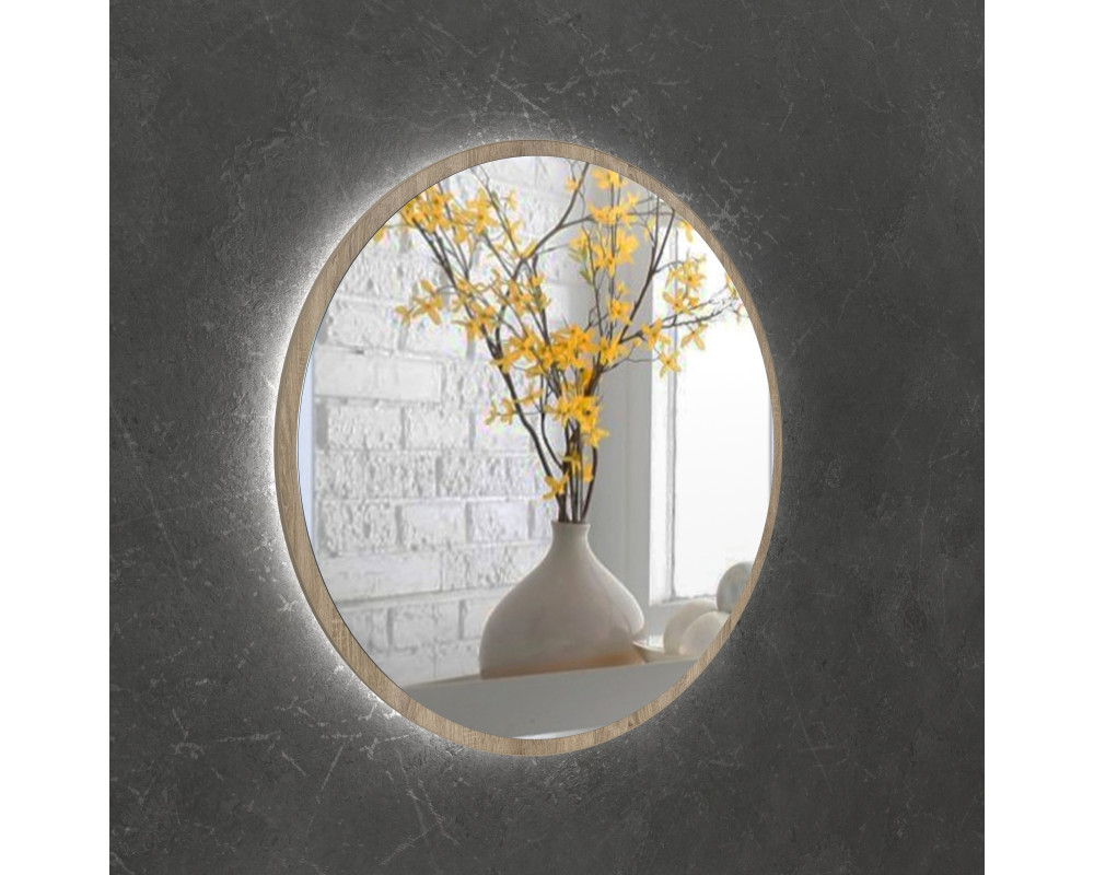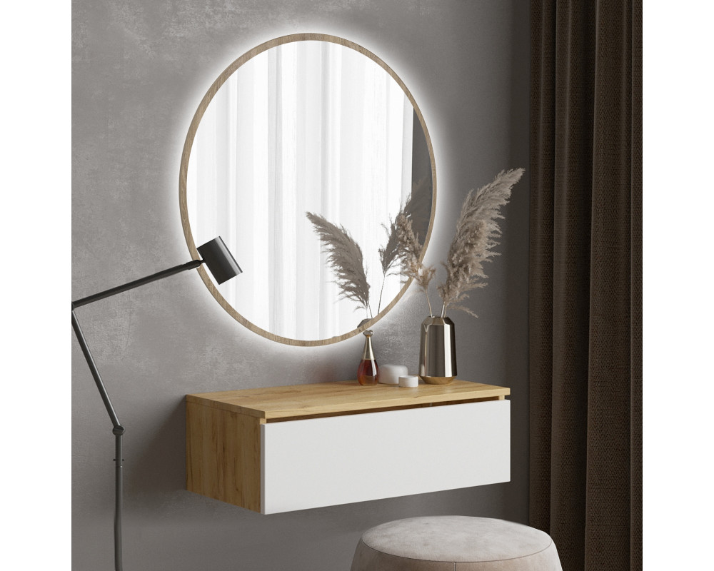 Зеркало на основе ЛДСП с подсветкой Art-com ZL1 Дуб сонома - это модель круглой формы с Led подсветкой, произведено в Украине. Состоит из зеркального полотна и основы в виде плиты ЛДСП 16мм (Kronospan). Основа выполнена в белом цвете и обклеена плотной кромкой.